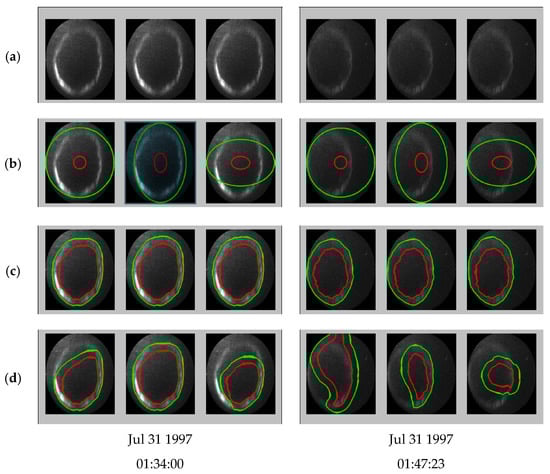 The segmentation results of LIDLSM and the deep feature-based adaptive level set (DFALS) model initialized by several different level set curves. (a) The UVI images captured by Polar satellite on Jul 31 1997 01:34:00 and Jul 31 1997 01:47:23. (b) The initial level set curves. (c) Segmentation results of the DFALS. (d) Segmentation results of the LIDLSM.