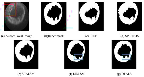 As shown by the red rectangle in Figure 11a, there exist dayglow contamination regions in the first UVI image. The auroral oval annotated by experts and segmentation results obtained by different methods automatically are also shown in Figure 11b–f. The RLSF, SPFLIF-IS, and SIIALSM models mistakenly identify the edge of UVI’s lens as the outer boundary of the auroral oval. In contrast, LIDLSM and DFALS obtain reasonable segmentation results. Compared with the LIDLSM, the DFALS model shows superiority on retaining the details of the inner boundary of the auroral oval, as shown by the blue rectangle in Figure 11f,g.