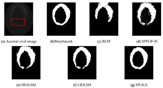 The third auroral oval image also includes low-contrast regions around the boundary, which is marked with the red box in Figure 13a. As seen from the segmentation results, the contours obtained by RLSF and SIIALSM break in the low contrast region, and SPFLIF-IS mistakes the noise pixels as part of the auroral oval. By comparing Figure 13b,f, we can conclude that although the boundary leakage does not appear in the segmentation result of LIDLSM, the extracted auroral oval deviates from the benchmark significantly in the low contrast region. However, regardless of the intensity inhomogeneity and image noise, DFALS yields the segmentation result that most closely matches the benchmark.