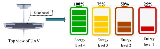 Green energy charging, such as solar panels, can increase the working time of the UAV, enhance the reliability of UAV processing tasks, provide more unloading services for terminal devices, and make the offloading system more flexible and easy to implement. This model considers using WPT technology to recharge the UAV with solar or wind energy. The tasks are assumed to be independent of one another, and the energy is in a dynamic process. The model differentiates the energy stored in the UAV from high to low into four levels, Elevel = {1, 2, 3, 4}. Energy level 4 is the state of abundant electricity between 100% and 75%. Energy level 3 is the power of the UAV after a period of operation, with electricity between 75% and 50%. Energy level 2 is the amount of electricity that the UAV runs for an extended time between 50% and 25%. Finally, energy level 1 is the state in which the UAV energy will run out, with electricity between 25% and 0%. Figure 3 shows the UAV energy level relationship.