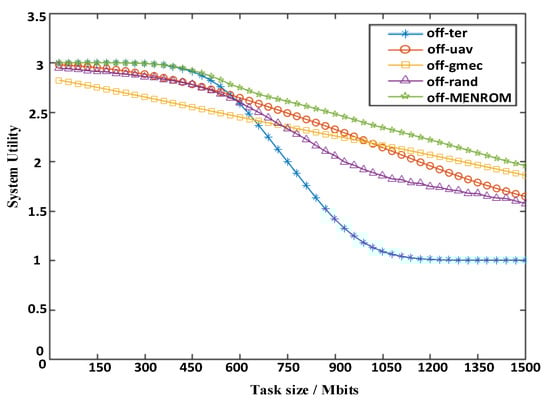 As shown in Figure 5, the utility function decreases with the increase of the task size when the model considers the energy level and delay parameters. The utility of the off-MENROM is always the largest. When the task is small, the off-ter utility is close to the off-MENROM utility. Conversely, when the task is large, the off-MEC utility is close to the off-MENROM utility. When the task increases, the system utility function decreases gradually because of the increase in computational cost. The multilevel offloading model can obtain a better utility value compared with other offloading methods, thereby indicating that the multilevel offloading model can save system costs, ensure user QOS, and optimize system resource allocation. When the task is small, the utility value of the terminal local computation is closer to the utility value of the best offloading mode. Meanwhile, when the computing task is large, the utility value of the task offloaded to the G-MEC after the UAV relay is closer to the utility value of the best offloading mode, that is, a larger task is suitable for off-GMEC offloading.
