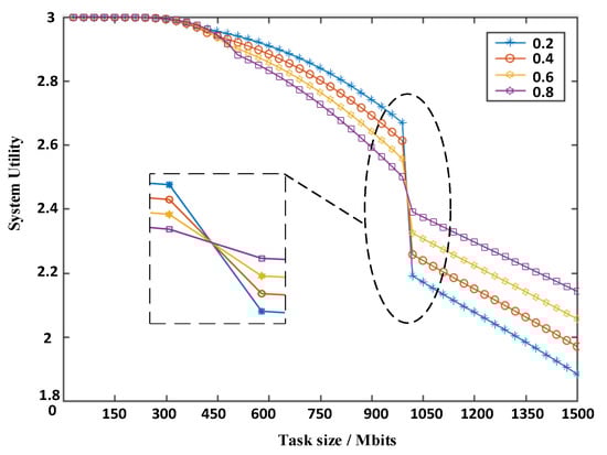 In Figure 8, the weight factor φ2 is 0.2, 0.4, 0.6, and 0.8. The changing trend of the system utility function is shown as the task increases (Figure 8). The task is medium-sized, and the smaller weight factor corresponds to a higher system utility. Moreover, when the task is large, the larger weight factor corresponds to a higher system utility. This situation arises because when the UAV is at energy level 3, the UAV has more available energy, and the higher weight of the delay cost will lead to a larger total cost and a lower utility function. Second-level offloading increases the system’s multiple energy consumptions compared with first-level offloading, and the high delay cost weight will reduce the system cost caused by high energy consumption. When switching offloading methods, the switching slope also varies because the weight factor has different effects on the system utility.