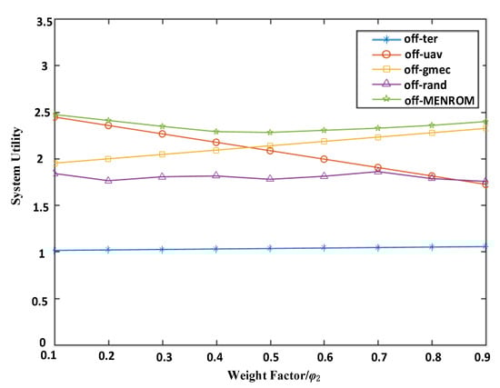Figure 10 shows the effect of the weight factor φ2 on the five scenarios with average utility functions in the case of a fixed task size with random UAV levels. In the UAV offloading scenario, the utility function decreases as the weight factor φ2 increases. In off-uav, the utility function increases with the increase of the weight factor φ2. The utility function of off-MENROM is superior to the utility function of the rest of the scenarios and is less affected by φ2. The off-MENROM is less influenced by weight factor φ2, and the utility function is more stable. Whether the system has a tendency to delay or energy, off-MENROM can identify a suitable offloading strategy and ensure system performance and reliability.