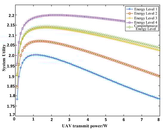 Figure 11 shows the relationship between the UAV transmission power and the system utility function at different energy levels. As the UAV transmit power increases, the system utility function initially increases and then decreases, so the network must have the best UAV transmit power to maximize the utility function. The optimal transmission power is approximately 1W, but the specific value cannot be obtained (Figure 11). Optimizing the UAV transmission power and using resources efficiently are noteworthy directions for future research.