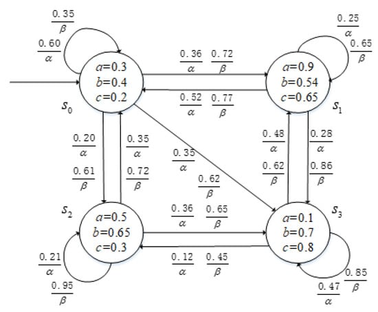 Let us take the generalized possibilistic decision process (GPDP) in Figure 1 as an example. The set of system states is denoted as ; represents the initial state of the system; denotes the set of actions; = 0.72 denotes that the possibility of the system changing from state to by action β is 0.72; the set of atomic propositions is . denotes that the possibility that atomic proposition b holds in the state is 0.4.
