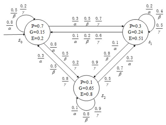 Assume that the doctors divide the patient’s status into three states, which are represented by , , and , respectively, that is, , and the initial state of the patient is . is the set of atomic propositions, where respectively indicate that the patient’s health status is “poor”, “general”, and “excellent” in a certain state. For these three health conditions of patients, different doctors understand differently. Therefore, we give them a fuzzy value to indicate the degree of physical health. For example, denotes that the degree that the patient’s health is “poor” on state is 0.7; let , which means that the doctors treat the patient with : three different treatment schemes. denotes that the possibility that this patient’s health status changes from the state to is 0.5 after the doctors adopt the treatment scheme .