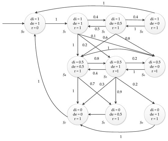 We use the intelligent washing machine studied in [18] as an example to better explain the application of the GPoμ model-checking method. As shown in Figure 3, it is the control system of the intelligent washing machine, where S0 to S10 are the states of the system, there is only one action in the system, and the possibility values are marked between states. The atomic propositions are dirty (di), detergent (de), and running (r), which denote the condition of the cloths, the state of the detergent, and the state of the system. The value of every atomic proposition is labeled at each state. For example, di = 1 means that the clothes are very dirty, di = 0.5 means that the clothes are moderately dirty, and di = 0 means that the clothes are clean. de = 1 means there is a lot of detergent, de = 0.5 means there is moderate detergent, and de = 0 means that there is no detergent. r =1 denotes that the machine is running, and r = 0 means that the washing machine is off. The initial state is S0, and the clothes are very dirty, there is a lot of detergent, and the system is off. From S1 to S2, it can be found that the dosage of the detergent is decreasing. At S3, the detergent is 0, but the clothes are still dirty, and the detergent should be added, so S3 may return to initial state S0 or return to S2. In addition, each state has a self-circulation, and the possibility is 1, which are omitted in the figure.