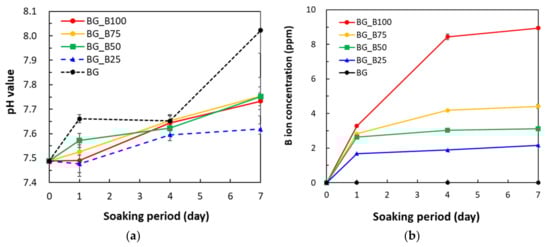 (a) pH value and (b) boron ions released into SBF after BG and B-doped BG soaking for 7 days.