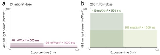 Blue light doses used in the experiment. Resulting blue light doses 0, 24 (a) and 208 (b) mJ/cm2 were achieved by the combination of time exposition and light intensity. The intensity of fluorescence light is shown in mW/cm2. Exposure time was 500 and 1000 ms, respectively.