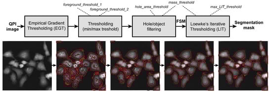 Image analysis was performed in customized Matlab R2019b (MathWorks, Natick, MA, USA) algorithm developed by our laboratory. The analysis process consists of segmentation, the interconnection of matching cells in adjacent time frames and extraction of the analyzed dynamical and morphological cell features. For cell segmentation in each frame, Loewke’s Iterative Thresholding (LIT) method [] was combined with Empirical Gradient Thresholding (EGT) technique []. EGT was shown to be a very robust and parameter-free foreground cell segmentation method (semantic segmentation) across various microscopical modalities []. On the other hand, LIT is a powerful technique for single-cell separation (instance segmentation), which is specifically designed for QPI images. LIT iteratively separates objects in “intensity valley” if the mass of separated objects is larger than the selected cell mass threshold. Our segmentation procedure is summarized in Figure 2.