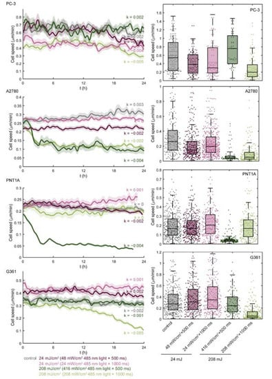 The motility of PC-3, A2780, PNT1A, and G361 cells was measured by using Q-PHASE multimodal holographic microscope. It was shown that light dose 208 mJ/cm2 × 1000 ms affected the motility of all types of malignant cells—PC-3, A2780, G361 (Figure 3). A2780 cells showed a distinctive decrease of motility from the beginning of the measurement while PC-3 and G361 cells decreased their motility after 15 and 20 h of measurement, respectively. The benign cell line PNT1A showed no motility changes in comparison with control by using light dose 208 mJ/cm2 × 1000 ms. The most intense light dose 208 mJ/cm2 × 500 ms decreased motility of all cell lines with the most visible effect on PNT1A and A2780 cells. Some effect was also observed in the PC-3 cells with blue light dose 24 mJ/cm2 × 500 ms.