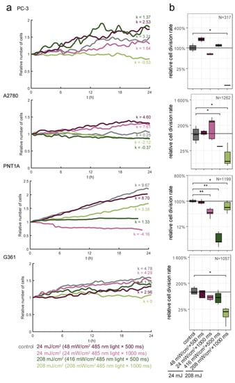 Cell numbers and cell division rate of cells affected by different doses of blue light. (a) Real-time QPI-measured changes in cell numbers of PC-3, A2780, PNT1A, and G361 cells during 24 h of the experiment. Lines are shown as the mean and standard error. K value means the slope of the least-square fitted line (increment of the value per hour). (b) Cell division rate relative to the division rate of control cells. * indicate p < 0.05, ** p < 0.01 by Wilcoxon test. The number of cells (N) shown for all treatments in a timepoint 0.