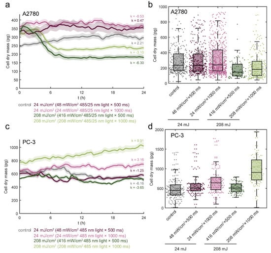 While cell mass in A2780 decreased quickly after exposure to blue light dose 208 mJ/cm2 × 1000 ms, the cell mass in PC-3 continually increased (Figure 5). These changes in cell dry mass (Figure 5a,b) and the decrease of the relative number of A2780 cells (Figure 4) indicate cell death in this cell line []. Indeed, a high rate of cell death was shown in the A2780 cell line under these conditions (Supplementary Video S2). On the other hand, the number of PC-3 cells during the 24 h-effect of light dose 208 mJ/cm2 × 1000 ms was not significantly changed and an increase in cell dry mass indicates anabolic processes in this cell line (Supplementary Video S3).