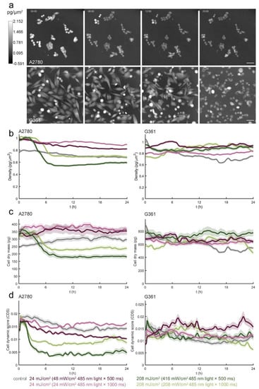 Since QPI has recently been used for detection and classification of cell death [,,,], based on these results, we hypothesized that light dose 208 mJ/cm2 × 1000 ms induce different types of cell death in A2780 and G361 cell lines. Based on the time-lapse videos (Supplementary Videos S2 and S4) and real-time quantitative parameters shown in Figure 6, it is evident that light dose 208 mJ × 1000 ms induces specific changes in cell dry mass, CDS, and density in A2780 and G361 cells. For the A2780 cells, all three parameters steeply decreased in the first six hours of the experiment and remained low. The data correspond with the videos, as it shows that the effect of the light dose on A2780 cells is fast and cells are dead. The dead cells are still adherent to the surface with the disrupted plasma membrane and there is an absence of blebbing or releasing of apoptotic bodies. This may suggest the cells underwent necrosis as these parameters are characteristic for this type of cell death [,]. On the other hand, G361 cells show a stable slight increase in cell dry mass and density, which decreased in the last two hours. CDS decreased after eleven hours of the experiment. The results for G361, supported by the video (Supplementary Video S4), imply that cells underwent apoptosis. These cells showed gradual cell rounding and a loss of surface contact followed by intensive membrane blebbing. It corresponds with known facts describing morphological changes during apoptosis []. Recently, several studies have described the characterization of cell death based on cell morphology using quantitative phase imaging [,,,]. In particular, mapping of the quantitative phase changes during the time seems to be very promising in the determination of various morphological phenomena related to cell death, because the responsible cell death molecular machinery typically changes the distribution of the cell mass (cell content cleavage by caspases and loss of attachment during apoptosis connected with increased density; cell swelling during some kinds of lytic cell death—decrease in cell density) [].
