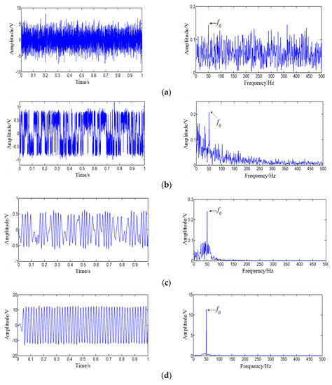 The output result of data processed by the CSR system is shown in Figure 3b. Simultaneously, R = 464, a = 19.7, b = 7217.3, and SNR is −20.53 dB. Although the high frequency components are suppressed, the SNR is improved, but at the same time of the scale transformation of the low frequency components, which also enhances the noise energy. The output result of data processed by the USSSR system is shown in Figure 3c. From the figure, we find that the amplitude of characteristic frequency is significantly increased. The system parameters are shown below: a = 2.343, b = 10431.666, k = 0.13, r = 131.44, and the output SNR = −11.49 dB. The simulation signal shows that when contrasted with the first-order SR system, the second-order SR system has better filtering characteristics. We inputted the signal to the SCSSR and the optimal parameters are gained: a = −5.5, b = 12.43, k = 0.54, r = 2.85, R = 147.2, and the output SNR is −2.684 dB. By observing Figure 3d, for this signal we find that the time-domain waveform shows its periodicity, the frequency component of 50 Hz is also clearly reflected in the amplitude spectrum, and there are almost no other frequencies. This fully demonstrates the reliability of the SCSSR method. To analyze the effect of the selected parameters on the results, we changed the parameters obtained by the SCSSR method and changed a = −5.5 to a = −100. The results are shown in Figure 3e. As can be seen from the Figure 3d,e, the system parameters greatly influence the results.
