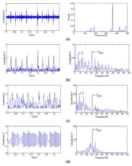 Rolling bearings are widely used in the field of engineering machinery. It is one of the parts with the highest failure rate, and causing problems in regard to quality and safety [1]. The fault monitoring and analysis of bearings usually deals with the vibration signals collected by sensors [2,3,4]. When the background noise of the vibration data is high and the signal-to-noise ratio (SNR) is low, it is very challenging to obtain the bearings’ fault features. In the context of loud noise, the traditional bearing fault analysis methods usually start with noise reduction [5,6,7,8,9,10]. Although these methods can reduce the noise, they also can weaken the effective characteristic signal [10,11,12,13,14,15,16,17,18].