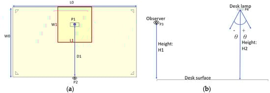 We set up a desk lamp for a study desk, as illustrated in Figure 1a, with a desk length and desk width of L0 and W0, respectively. P1 and P2 indicate the positions of the desk lamp and observer, respectively; the distance between them is D1. As shown in Figure 1b, the observer and desk lamp are positioned at P3 and P4 above the desk surface at height H1 and height H2. The calculation object has a length and width of L1 and W1, respectively. The observer on the edge of the desk indicates a student in front of the desk. We set the desk lamp rotation angles as +θ and −θ. Table 1 shows the simulation setup parameters.