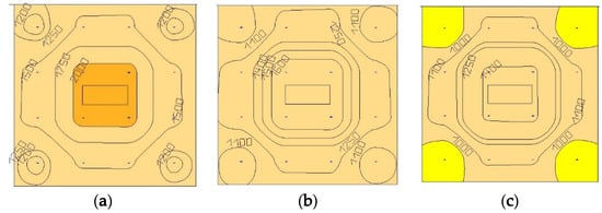 Figure 5 shows the isoline and color illumination map (lux) with different light source heights: 35, 40, 41, 42, 43, 44, 45, 46, 47, 48, and 50 cm, respectively. Figure 5g shows the lux isolines simulated using a 45 cm high desk lamp; the 1000–1400 lux isoline is distributed in most of the space and the >1000 lux isoline is at the four corners, as indicated by the orange and yellow regions, respectively.