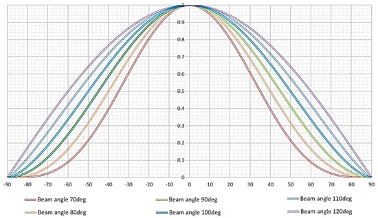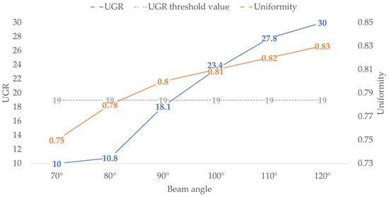 The luminous intensity field for a beam angle of 70° was the narrowest; with an increase in the beam angle, the luminous intensity field widened. In the determination of the UGR, a narrow beam angle outperformed a wide beam angle. By contrast, in the determination of the illumination uniformity, a wide beam angle was superior to a narrow beam angle. Table 3 and Table 4 show the homogenized UGR and uniformity values, respectively.