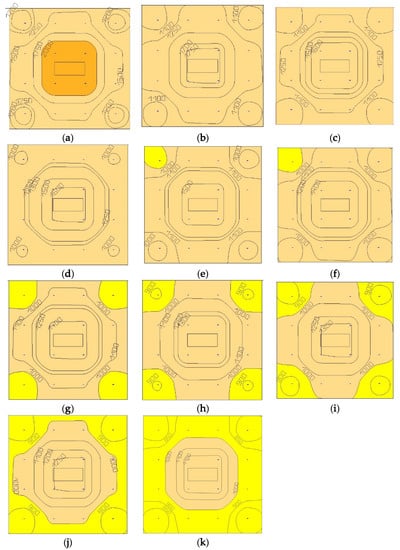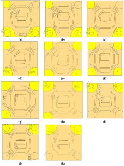 Isoline and color illumination map (lux) with different light source heights: (a) 35 cm, (b) 40 cm, (c) 41 cm, (d) 42 cm, (e) 43 cm, (f) 44 cm, (g) 45 cm, (h) 46 cm, (i) 47 cm, (j) 48 cm, and (k) 50 cm.
