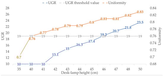Table 5 and Table 6 present the homogenized UGR and uniformity values, respectively. Figure 6 shows the variation in the UGR and the uniformity with the desk lamp height. For a beam angle of 90° and desk lamp height of 45 cm, the UGR is less than the threshold value of 19, and the uniformity is higher than that for heights of 35, 40, 41, 42, 43, and 44 cm.