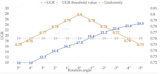 For the determination of the illumination and uniformity, a rotation angle of 0° was better than other rotation angles. Table 7 and Table 8 show the homogenized UGR and uniformity values, respectively. Figure 8 shows the variation in the UGR and the uniformity with the rotation angle. For a rotation angle of 0°, the UGR was less than the threshold value of 19, and the uniformity was higher than that for the other rotation angles.