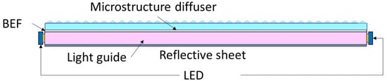 Figure 9 shows a side view of the structure of the desk lamp module. It contains a microstructure diffuser, a brightness enhancement film (BEF), a light guide, a reflective sheet at the bottom, and two LED strips on opposite sides of the light guide. The desk lamp has a width of 42.5 mm, height of 12 mm, and length of 100 mm. The LED model used was Lextar PC35H11, the color temperature of 4000 K and a color-rendering index of 80 was used.