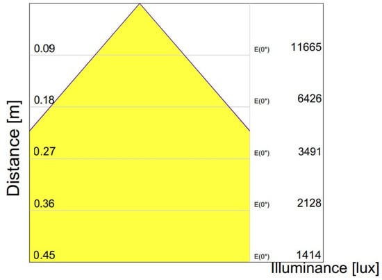 Figure 11 shows that the illumination values at heights of 0.27, 0.36, and 0.45 m were 3491, 2128, and 1414 lux, respectively, for a beam angle of 90°. The horizontal coordinate axis represents the illuminance and the vertical coordinate axis represents the distance from the light source.