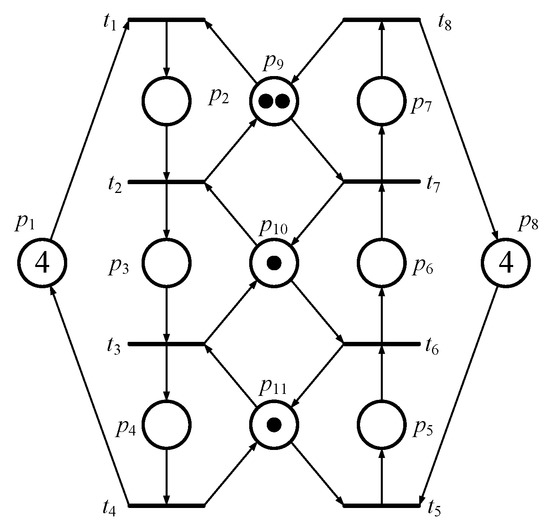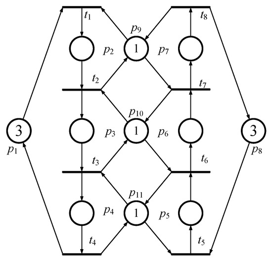 A Petri Net [52], also called a Place/Transition Net, is a four-tuple N = (P, T, F, W). Both P and T are non-empty sets. Generally, P is a finite set of places, and T is a finite set of transitions, disjointed to each other. The set is the arcs of this net, which is represented by one-way arrows from its nodes to denote a flow relation in a PN model. The mapping assigns a weight to an arc: if , and otherwise; where and is the set of non-negative integers. We call the postset of , and is called the preset of x. A marking is a multi-set of its places, which allocates tokens to each place of PNM. We denote as the number of tokens in place . The pair is called a marked Petri net or a net system. A net is pure if implying that . The incidence matrix of the pure net is a integer matrix with .