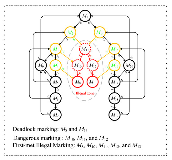 - Huang, Y.S.; Pan, Y.L. An improved maximally permissive deadlock prevention policy based on the theory of regions and reduction approach. IET Control Theory Appl. 2011, 5, 1069–1078. [Google Scholar] [CrossRef]