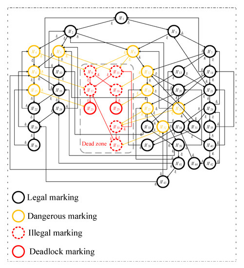 In the Reachability Graph (RG) method, all reachable markings in the initial reachability graph analysis can be divided into two main groups: illegal and legal markings [35]. Illegal markings include deadlock and quasi-deadlock markings. The set of deadlock markings is defined as follows:
