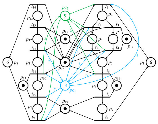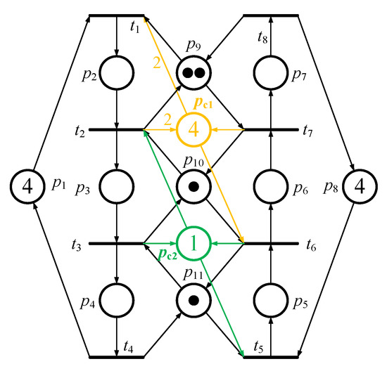 where both and are non-negative integers, and denotes the number of tokens in place . Furthermore, for calculating the controllers of a system, more non-negative integers are given and the new equality is as follows:
