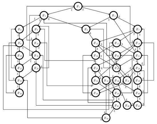 The first model, shown in Figure 3, has two idle places (i.e., p1 and p8), six activity places (i.e., p2-p7), and three resource places (i.e., p9-p11). Additionally, there are 44 reachable markings (i.e., M1-M44) in total, including 8 FBMs (i.e., M9, M11, M17, M18, M23, M25, M30, and M37) and 36 legal markings in its reachability graph, respectively. Its reachability graph is also shown in Figure 4.