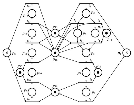 According to the definitions in [5,8], three types of places are given for FBM based on PN theory, including Idle places , Resource places , and Activity places , respectively. The initial marking of a reachability graph of a PNM is denoted as . The activity places must be considered among all kinds of places in using the PI concept [41].