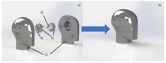 (a) Split headform exploded view. (1) Printed left- and right-hand sides, (2) uni-axel load cell, (3) load distribution plates, (4) mounting bolts. (b) Split headform assembly.