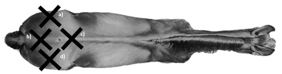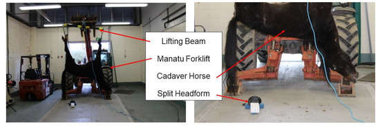 A Manatu forklift and lifting beam was used to lift the cadavers to the drop height (see Figure 3). A quick release hook clamp was used to drop the cadaver. For the un-helmeted tests, four impact locations were chosen on each horse, the left hind quarter, the right hind quarter, lumbosacral vertebrae, and the sacral vertebrae (see Figure 4). These impact locations were chosen based on the analysis of video footage of horse falls and they also represented the largest area of the animal that is not covered by a saddle, apart from the head and neck. For each horse, 3 drops were carried out per impact location. The helmet model used was a commonly available 57 cm jockey style equestrian helmet, certified to ASTM F1163-15 [7], EN 1384 [8] and PAS015 [9]. and Ideally, other equestrian helmet models would also have been tested. However, due to availability and price constraints, this common and widely used helmet model was chosen as a good representative of commercially available helmets for the 50th percentile male sized head. Helmeted tests were carried out on the lumbosacral vertebrae junction and the sacral vertebrae locations, as these were found to be the most stable locations in terms of drop test repeatability. Additionally, only the heavier male animal was used for the helmeted tests, as the number of helmets available was limited to six. The force–time data were recorded for each drop test. In total, 30 drop tests were carried out: 24 un-helmeted tests and 6 helmeted tests. Means and standard deviations were calculated for repeated tests at each impact location and for all impact locations combined. Peak load data were analysed statistically using a one-way ANOVA with post-hoc t-tests (α = 0.05) between helmeted and un-helmeted tests and between impact locations to determine statistically significant differences.