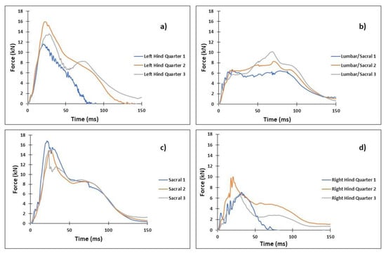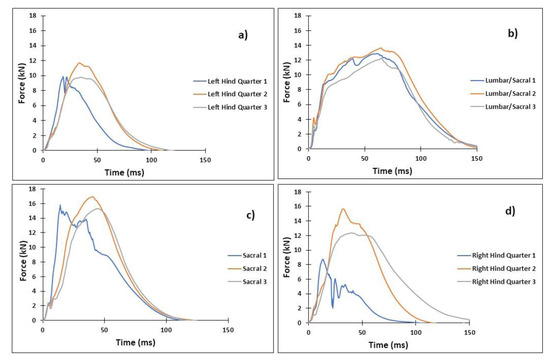 Un-helmeted drop test force–time history plots for horse 1. (a) Left hind quarter impact location. (b) Lumbosacral vertebrae junction impact location. (c) Sacral vertebrae impact location. (d) Right hind quarter impact location.