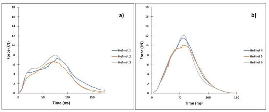 Helmeted drop test force–time history plots for horse 2. (a) Lumbosacral junction vertebrae impact location. (b) Sacral vertebrae impact location.