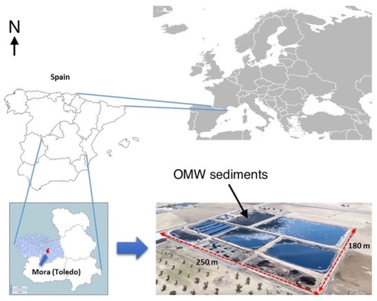 We used OMW sediments from abandoned OMW evaporation ponds located in Mora municipality (39°40′ 07.4″ N 3°49′ 40.2″ W, Toledo, Spain), which occupy a total surface of 5 ha including eight evaporation ponds (2400 and 12,000 m2) (Figure 1). Disposal of OMW at the study area started in 1982 and ended in 2007, and currently many of them contain concentrated OMW sediments. Samples of OMW sediments were collected for physicochemical characterization and measuring total water-soluble phenolic compounds (Table 1). The soil used (22% clay; 27% silt, 50% sand) had 1537 kg/m3 of bulk density, with a plant available water storage capacity of 42 mm, alkaline reaction, low electrical conductivity and organic matter content (Table 1), being classified as Cambisol derived from carbonatation of parental granite [16]. Adult individuals of L. terrestris were obtained from a local supplier and maintained in temperature-controlled chambers (Radiber S.A., Barcelona, Spain) (15 °C and permanent dark) following the recommendations by Lowe and Butt [17] until they were used in toxicity testing. The soil used in the earthworm culture was the same as that used in the toxicity testing with OMW sediments.