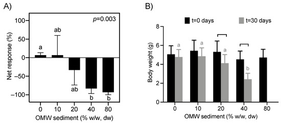 We found no individual dead after 48 h of incubation in the ABR test, and they randomly distributed between both sections, as suggested by the similar percentages of earthworms found in the control treatment (53.3% ± 5.8% in one section and 46.7% ± 5.8% in the opposite section). However, the addition of OMW sediment to soil at the doses of 40% and 80% w/w caused a significant avoidance response (F4,4.72 = 20.7, p = 0.003) with respect to the control treatment (Figure 2A). The ABR test is a common screening test for assessing soil pollution [38], and it is generally accepted that avoidance response is judged as significant when more than 80% of earthworms are found in the compartment containing the control soil. This is a threshold value that defines the soil habitat limit, as suggested by Hund-Rinke et al. [39]. Many studies have used the ABR test to evaluate the potential toxicity of soils contaminated by metals [40], pesticides [41,42], cyanotoxins [43], veterinary pharmaceuticals [44], microplastics [45] or soil additives such as biochar [46,47]. Although the ABR test guidelines recommend the use of the epigeic earthworms Eisenia fetida or E. andrei [19], soil-dwelling earthworm species such as L. terrestris are now adopted in standardized methods such as the ABR test [48]. Moreover, some studies suggest that L. terrestris is more sensitive to organic pollutants such as pesticides than the common and recommended species E. fetida [49].