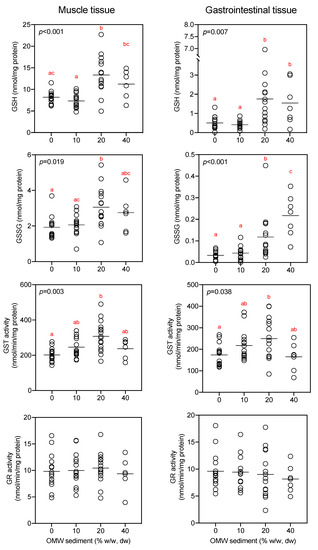 Response of glutathione-dependent antioxidant mechanisms in the body wall muscle and gastrointestinal tract of earthworms after 30 d of exposure to olive mill waste (OMW)-amended soils. Horizontal solid lines in the univariate scatterplots are the mean values. Different letters denote statistical differences (p < 0.05, Games–Howell post-hoc test). GSH = reduced glutathione, GSSG = oxidized glutathione, GST = glutathione S-transferase, GR = glutathione reductase.