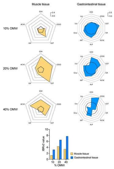 Biomarker responses of control earthworms measured in this study were comparable to other studies that used the same species [18]. Therefore, we can assume that these are baseline values for these biomarkers, so they can be used as reference values in IBRv2 index calculations [38]. The IBRv2 index is commonly used to integrate the responses of multiple biomarkers measured in organisms inhabiting polluted sites compared to organisms from reference (unpolluted) sites [54,55]. In the present study, we found that IBRv2 values of OMW-exposed earthworms markedly increased from control earthworms, varying from 3.22 (10% OMW) to 7.71 (40% OMW) for the gastrointestinal tissue, and from 1.33 (10% OMW) to 3.40 (40% OMW) for the body wall muscle (Figure 4). This increase was dose-dependent in the case of the gastrointestinal tissue. The results suggest that the IBRv2 index assists in the data interpretation of multiple biomarkers, which have different responses to pollutants (inhibition or induction).