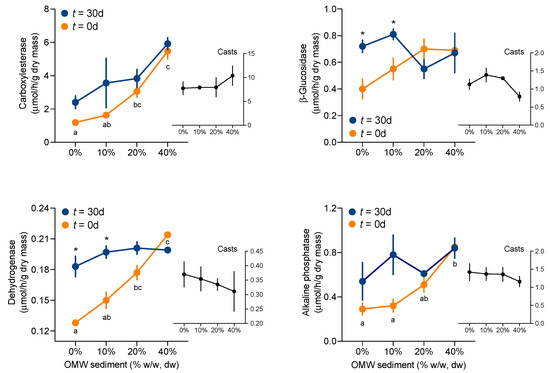 Mean (± SEM) enzyme activity in olive mill waste (OMW)-amended soils at t = 0 d and after 30 d of incubation. Different letters indicate significant differences between OMW treatments (p < 0.05, Welch’s t post-hoc test), whereas asterisks denote differences between soils inoculated with earthworms and earthworm-free (p < 0.05). Inset plots show the mean (± SEM) enzyme activity in casts collected from the soil surface after 30 d of incubation.