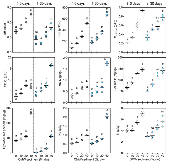 Variation of physicochemical parameters in olive mill waste (OMW)-amended soils during 30-d incubation in the presence of earthworms (Lumbricus terrestris). Different letters denote significant differences between treatments within a sampling time (normal fonts for t = 0 d, and cursive fonts for t = 30 d), ANOVA with Welch’s homogeneity correction (p < 0.05). Horizontal solid lines in the univariate scatterplots are the mean values.
