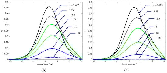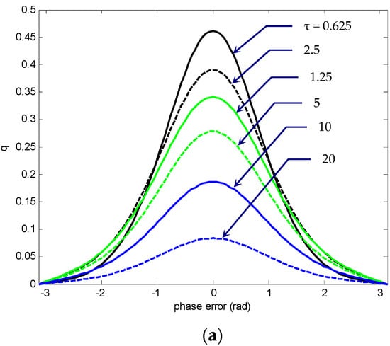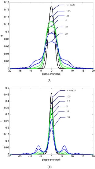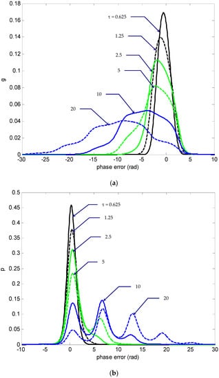 First of all, the time-evolution of PDFs is investigated to reveal detailed evolution of the time-dependent PDFs of the PLL. Typical results for the time-evolution of nonmodulo-2π transient statistics for SNR and detuning factor are shown in Figure 2, Figure 3 and Figure 4. The grid spacing for the phase-error domain is chosen as rad; the grid spacing in the time marching direction is set as 0.01. Figure 2 shows the transition phase-error density function and the PDF . The numbers beside individual curves indicate the normalized times, switching τ from 0.625 to 20. The corresponding cumulative probability distribution of the phase-error is depicted in Figure 3. Typical time-evolution of , as shown in Figure 2b, revealed that as P diffused with time, the probability that the phase would jump out of the primary interval was the same as the probability that it would jump into that interval, implying that the possibility of larger phase error increased. In the case of , both of the error density functions and diffuse with time while remaining symmetric with respect to the phase-error axis, and thus the initial global peak values of the density functions g and p at zero phase error () decreased as time progresses. As functions of , the local peak positions of p appeared at a period of 2π rad. The amplitudes of local peaks were monotonically nonincreasing when moving outwards from their mean values with respect to the phase-error axis. The figures and later ones as well only show part of the results. In Figure 2 and Figure 3, the results at a phase error between −20 and 20 rad were the area of interest. Figure 4 provides the three-dimensional plots for nonmodulo-2π transition g and p, respectively, for more profound insights into the statistics information, especially the relation between g/p and phase error, as time progresses. Both the front view and back view are shown such that better understanding on the behavior of PLL statistics is accessible. The result enabled us to mathematically quantify the difference among different PDFs, providing a meaningful conceptual link between the stochastic process and information geometry, and could be utilized for optimizing various desired outcomes.
