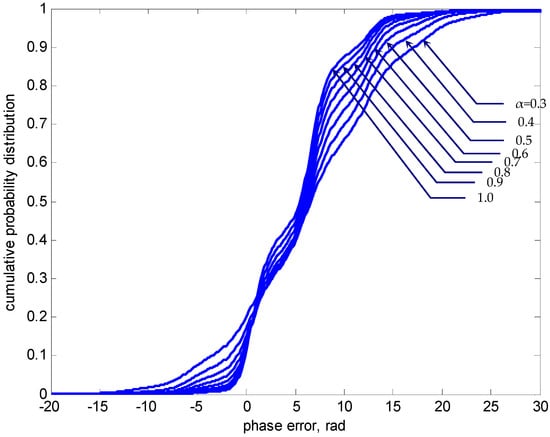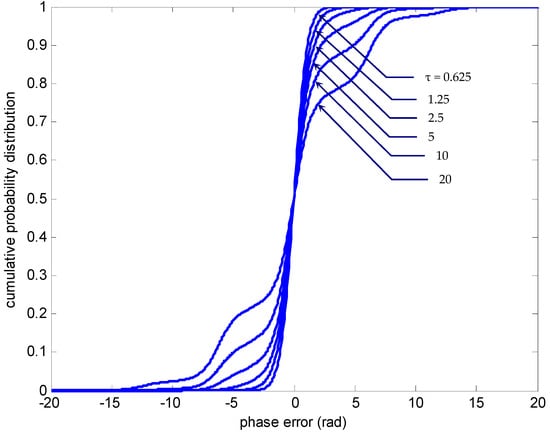 Figure 18 provides the comparison on variation of modulo-2π phase-error steady state PDF and cumulative probability distribution function for various detuning factor where SNR was utilized. The numbers beside individual curves indicate the detuning factors in the range 0–. It can be seen that, initially with a symmetric shape, became the left-skewed distribution. The peak moved rightwards with its amplitude decreasing as increased. Figure 19 provides the variation of modulo-2π phase-error steady state PDF and cumulative probability distribution function, respectively, of the phase error at τ = 0.625 for the SNR values α in the range 0–1 in the case of . The numbers beside individual curves indicate the SNR values α. It can be seen that, the peak value of appeared at and was monotonically decreasing, while remaining symmetric with respect to the phase-error axis as α was increased. For a very high SNR (), resembled a unity Gaussian distribution, while for very low SNR (), it became flat and approached a uniform distribution from –π to π, with the PDF , implying that the phase was completely unknown.