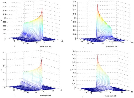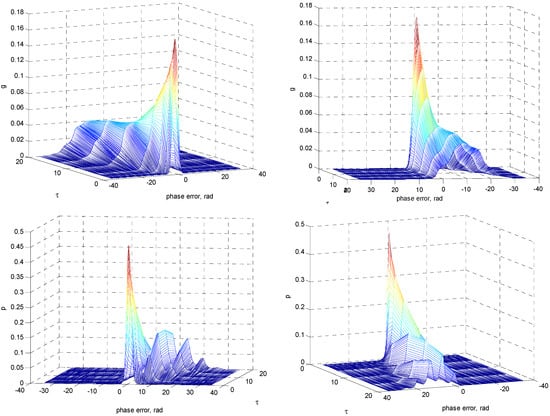 Figure 5, Figure 6 and Figure 7 provide information basically similar to that of Figure 2, Figure 3 and Figure 4, and thus the parameter values were identical except that the detuning factor was now changed to . The identical numerical values including the normalized time (τ), the grid size for the phase-error domain () and the grid size in the time marching direction () were utilized for comparison. It can be seen that in this case the density functions diffused to one direction as time progresses, given a certain SNR (e.g., as demonstrated here). The error probabilities g and p diffused virtually in opposite directions. In this example, g virtually diffused leftwards while p diffused rightwards. As can be seen, p had a right-skewed (or positively skewed) distribution, and most data fell to the right (positive direction) of the graph’s peak. The histogram skewed in such a way that its right side (or “tail”) was longer than its left side. Again, for the density function p, there were local peaks appearing with a period of 2π rad. It should be noticed that the position of global peak of p, which initially appeared at the phase error near by zero, moved rightwards as time progressed. As can be seen, the peak position appeared at 2π rad away from its original position when τ exceeded a certain value, e.g., τ = 10 in this illustration. According to Equation (10), if the solution is properly resolved, the total probability remains constant (=1) for all time. The cumulative probability distribution can be used to check the result. As compared to the actual total probability, the numerically calculated cumulative probabilities for various normalized time are summarized in Table 1. The errors using the numerical approach was of the order of 0.02% to 0.5% depending on the various τ, for and , respectively. For better resolution that is required, a smaller grid can be utilized.