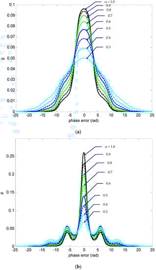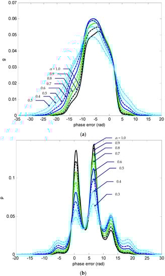 In the next example, an illustration of how the SNR α influences the information geometry of the phase-error statistics is presented. Figure 8, Figure 9 and Figure 10 provide the results of the nonmodulo-2π statistics at normalized time for SNR α in the range 0.3–1 where the detuning factor was utilized. The results are shown to capture the effect of different SNR values and understand the information changes on the error-phase statistics of PLL. Figure 8 presents the phase-error density function and the PDF and Figure 9 shows the corresponding cumulative probability distribution of . The numbers beside individual curves indicate the various SNR values. Again, three-dimensional plots for nonmodulo-2π g and p, respectively, are given in Figure 10. As in the presented case where was utilized, both the density functions g and p remained symmetric with respect to the phase-error axis as α varied. As α decreased, the global peak values of the density functions at decreased and thus the initial narrow density functions became ‘flatter’, implying that the variance the phase error increased, and the possibility of a larger phase error increased. As functions of , the local peak positions appeared at a period of 2π rad when moving outwards, with the peak amplitudes monotonically nonincreasing.