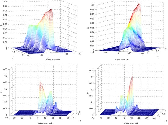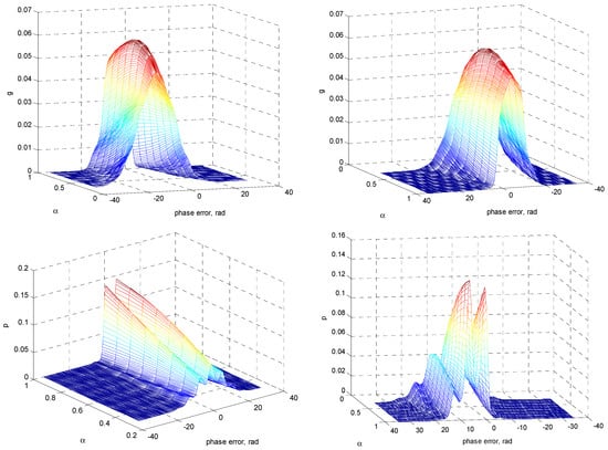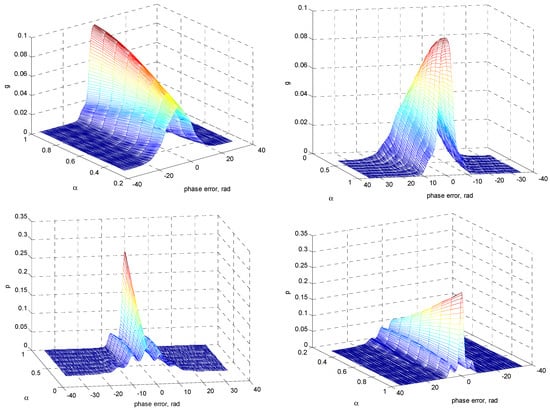 Figure 11, Figure 12 and Figure 13 elucidated information similar to that of Figure 8, Figure 9 and Figure 10, and the parameter values were identical except that the detuning factor was utilized. It can be seen that the density functions g and p virtually stretched (or expanded) to one direction where they stretched to opposite directions. As shown in this example, g had a left-skewed distribution, while p had a right-skewed distribution. The density p shows that the peak values appeared at the phase error near by 2π rad. As α decreased, p tended to be flatter, and the variance of the phase error increased. Three-dimensional plots of information geometry were provided such that more comprehensive understanding could be gained on the relationship among the parameters, p/q, , and α.