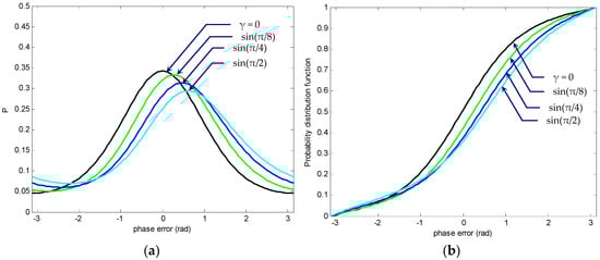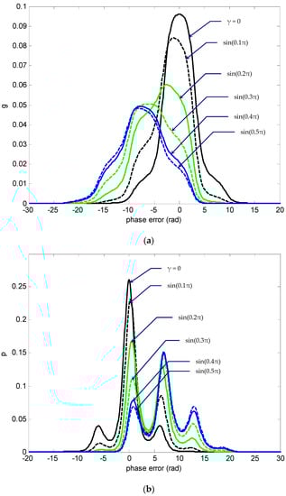Nonmodulo-2π phase-error (a) density function and (b) PDF , at for various detuning factor γ when SNR .